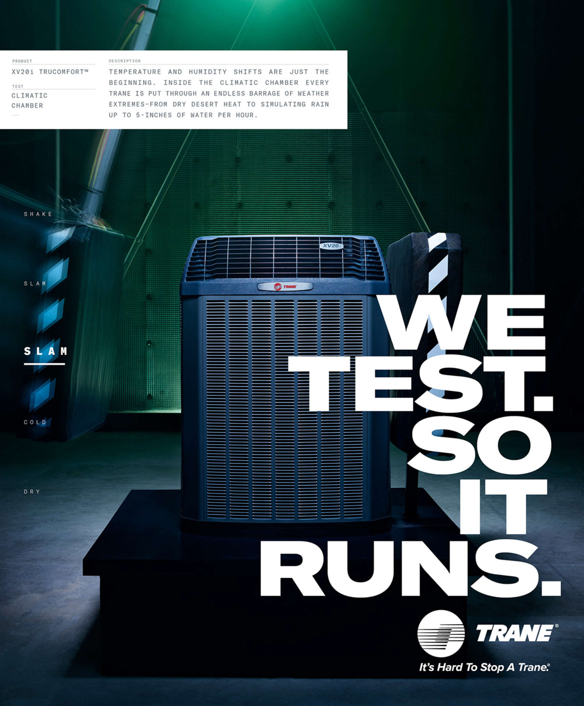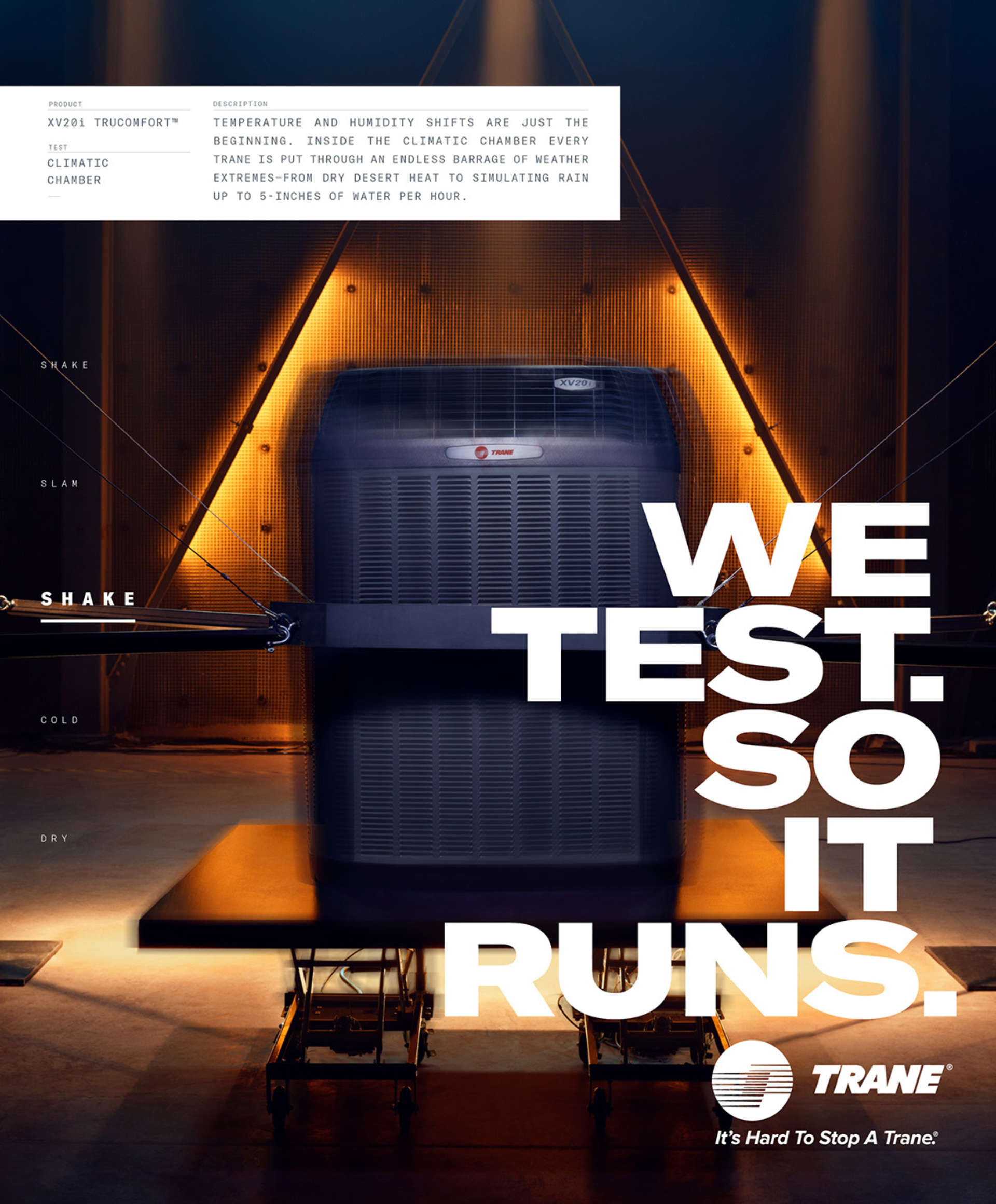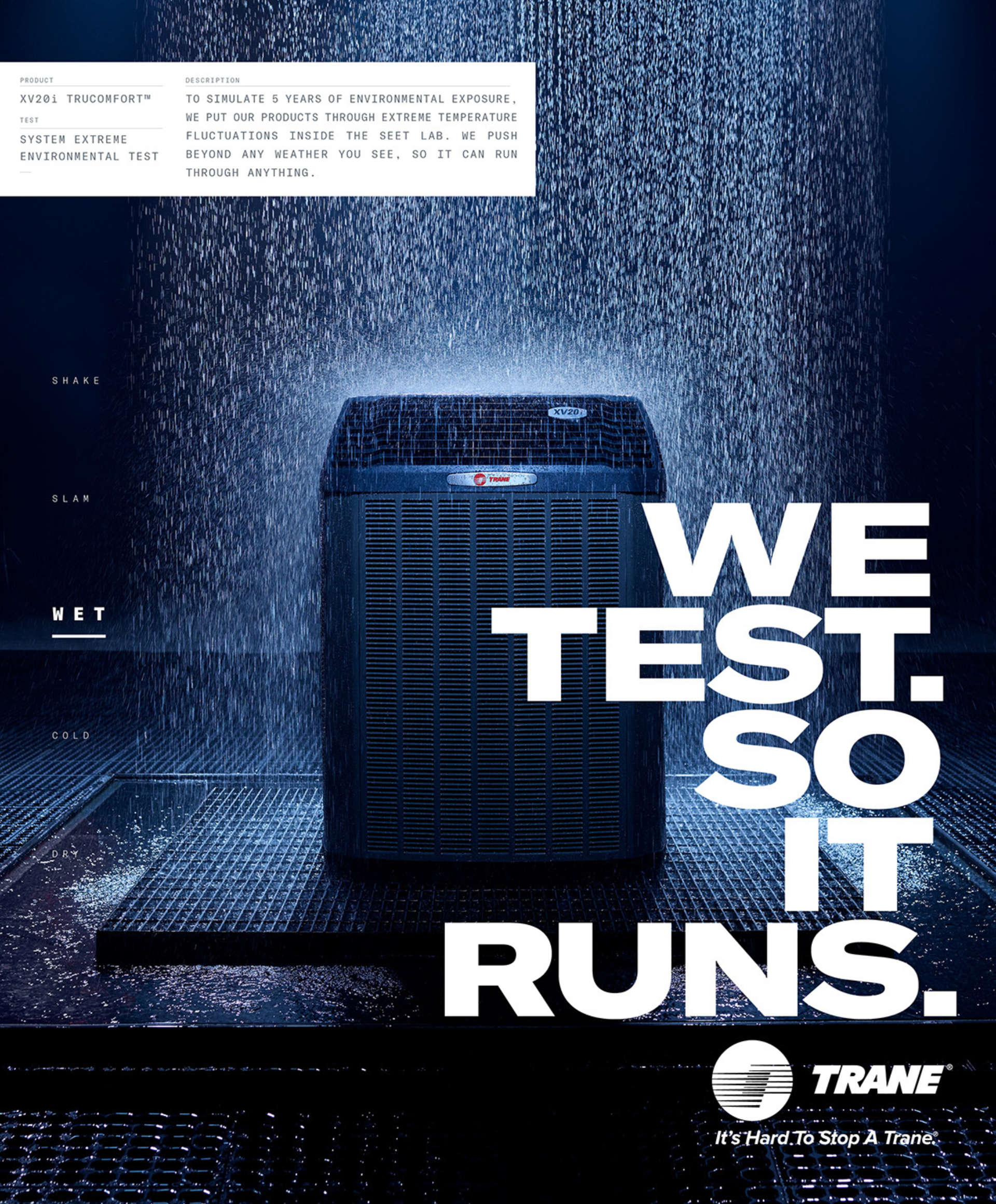 And that’s to test it against everything. Which is why Trane’s team of engineers and quality technicians run their products through the gauntlet, drenching them with rain, pounding them with heat, and pummeling them with high-speed impact.